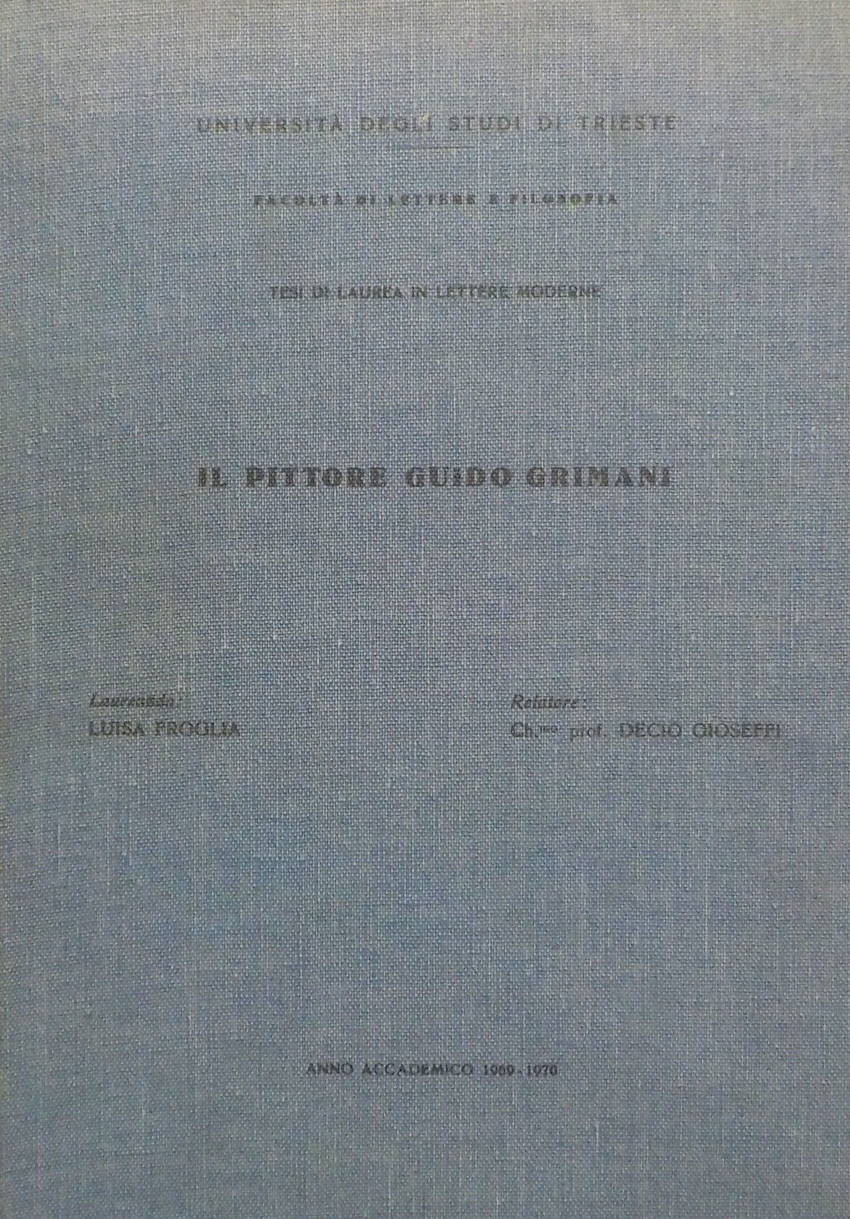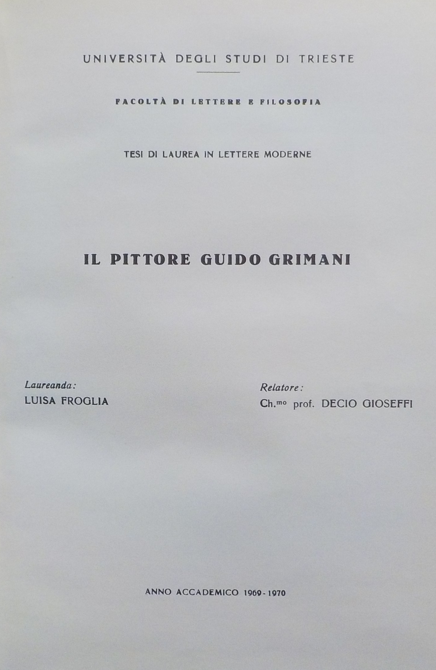 Il *pittore Guido Grimani / laureanda: Luisa Froglia ; relatore: Ch.mo prof. Decio Gioseffi. - Trieste : Università degli Studi di Trieste, anno accademico 1969-1970. - 218 p. ; 31 cm. ((In testa al frontespizio: Università degli Studi di Trieste ; facoltà di Lettere e FIlosofia ; Tesi di laurea in Lettere Moderne