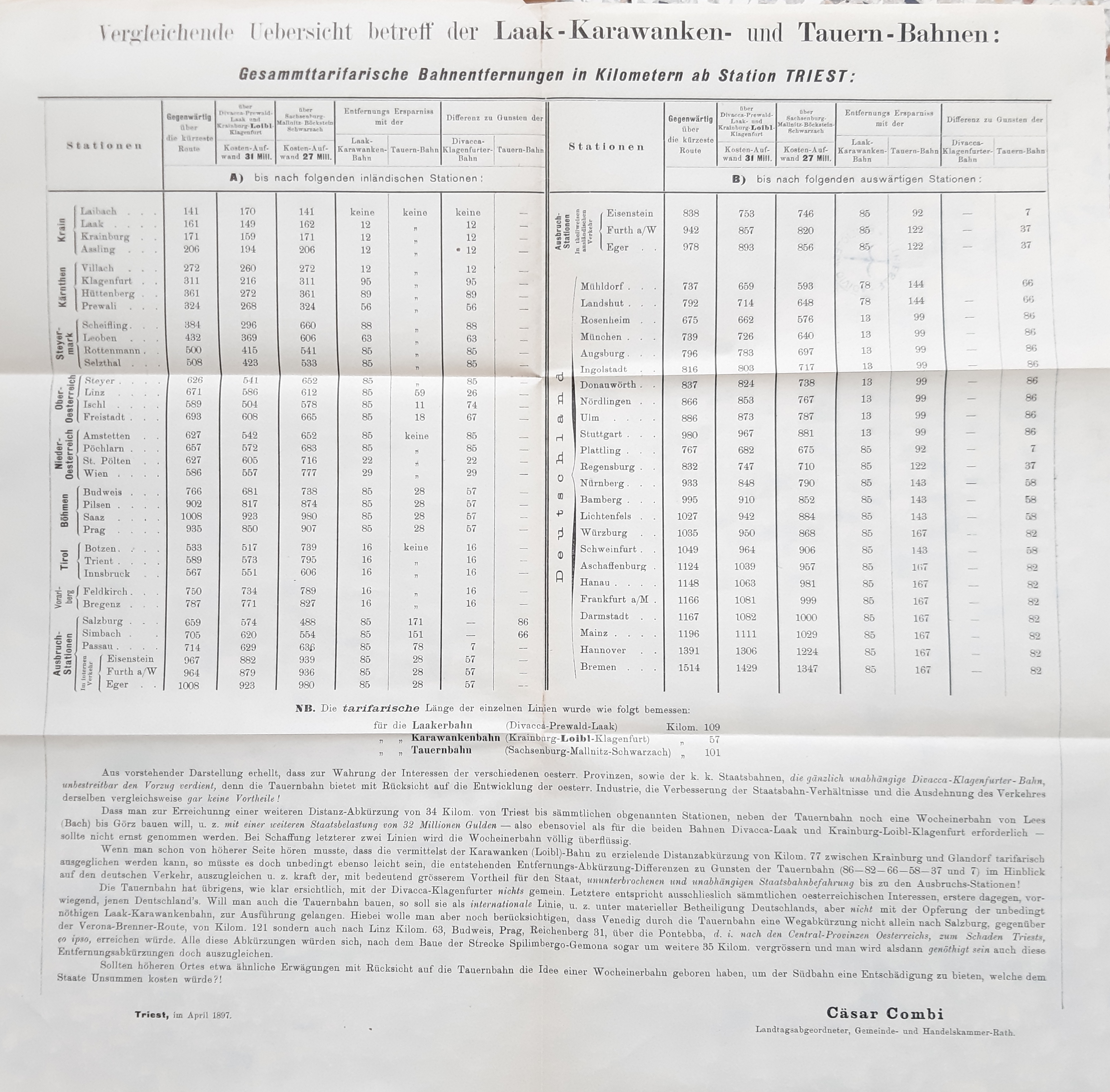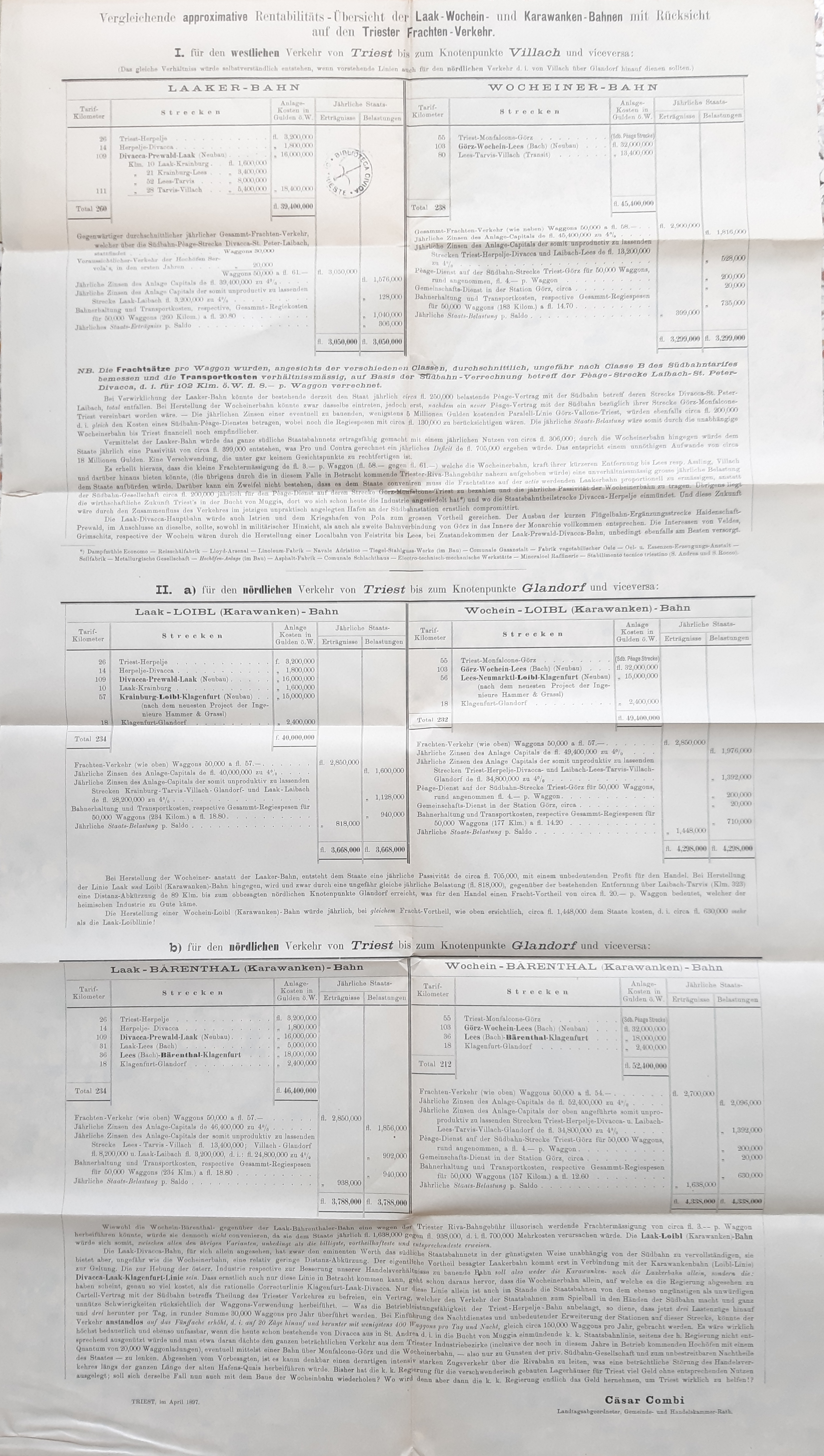 Die *Lösung der südoesterreichischen Eisenbahnfrage : Ein offenes Wort an die P. T. Mitglieder des hohen Reichsrathes! / Cäsar Combi. - Triest : Cäsar Combi, 1897 (Buchdruckerei Tomasich). - 11 p., [3] c. di tav. ripieg. ; 24 cm. ((Con 1 carta geografica delle ferrovie della zona Vienna-Trieste, e 2 fogli di notizie.