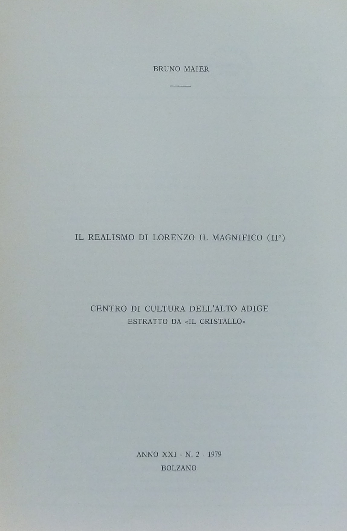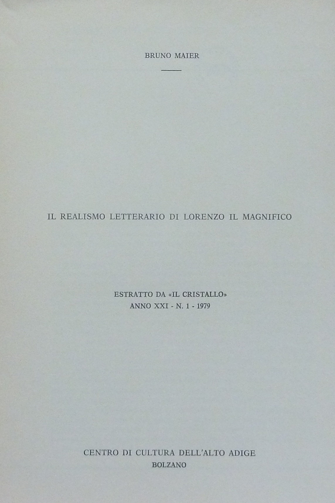 Il *realismo letterario di Lorenzo il Magnifico / Bruno Maier. - Bolzano : Centro di cultura dell'Alto Adige, 1979. - 47-62 p. ; 25 cm. ((Estratto da: Il cristallo, anno 21, n. 1 (1979)