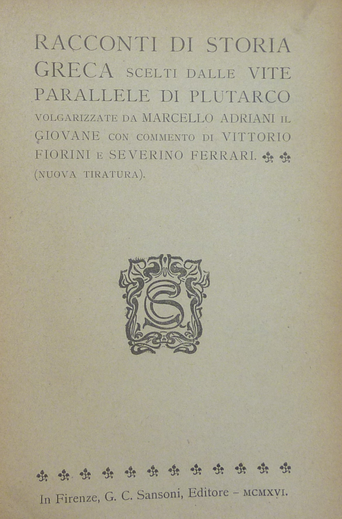 *Racconti di storia greca : scelti dalle Vite parallele di Plutarco / volgarizzate da Marcello Adriani il giovane ; con commento di Vittorio Fiorini e Severino Ferrari. - Firenze : Sansoni, 1916. - VIII, 208 p. ; 20 cm. ((Sul front.: Nuova tiratura.