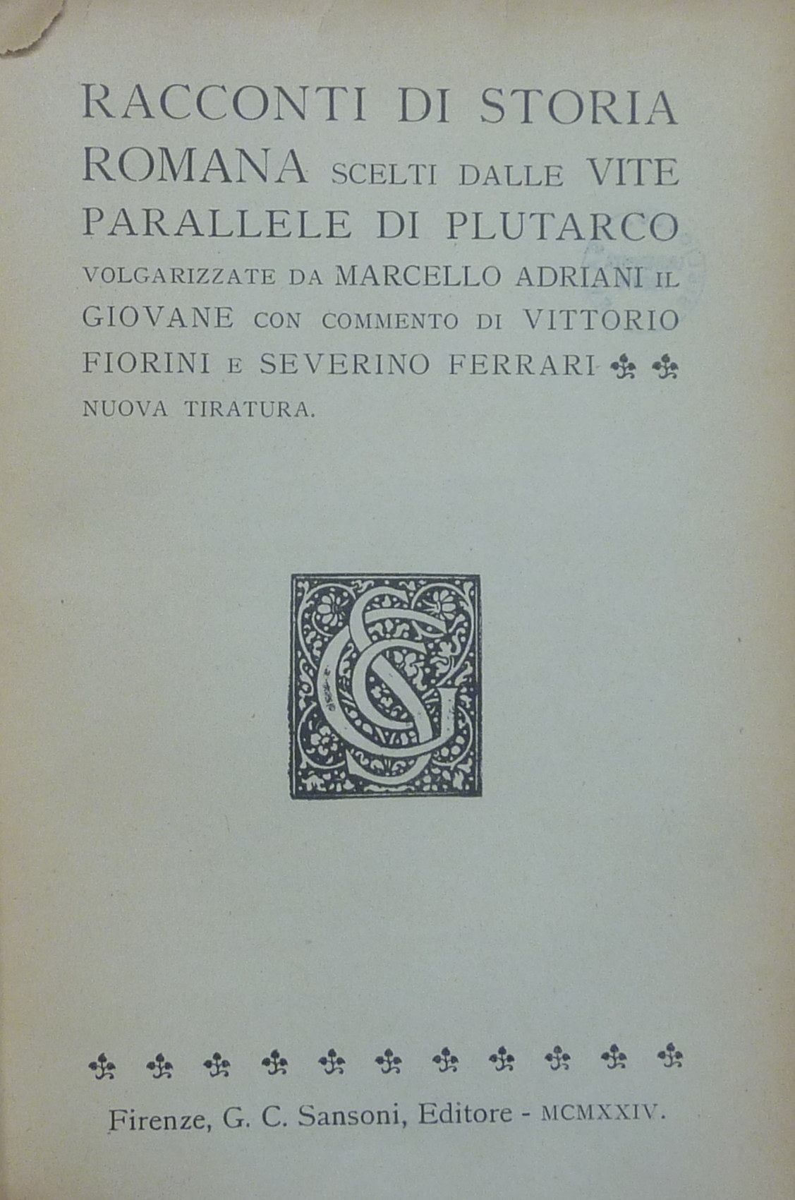 *Racconti di storia romana scelti dalle Vite parallele di Plutarco volgarizzate da Marcello Adriani il giovane / con commento di Vittorio Fiorini e Severino Ferrari. - Firenze : Sansoni, 1924. - VIII, 314 p. ; 20 cm